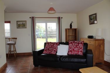 Fireplace. Bay window with sea view. Sliding door to rear patio. Storage heater. Cupboard under stairs.